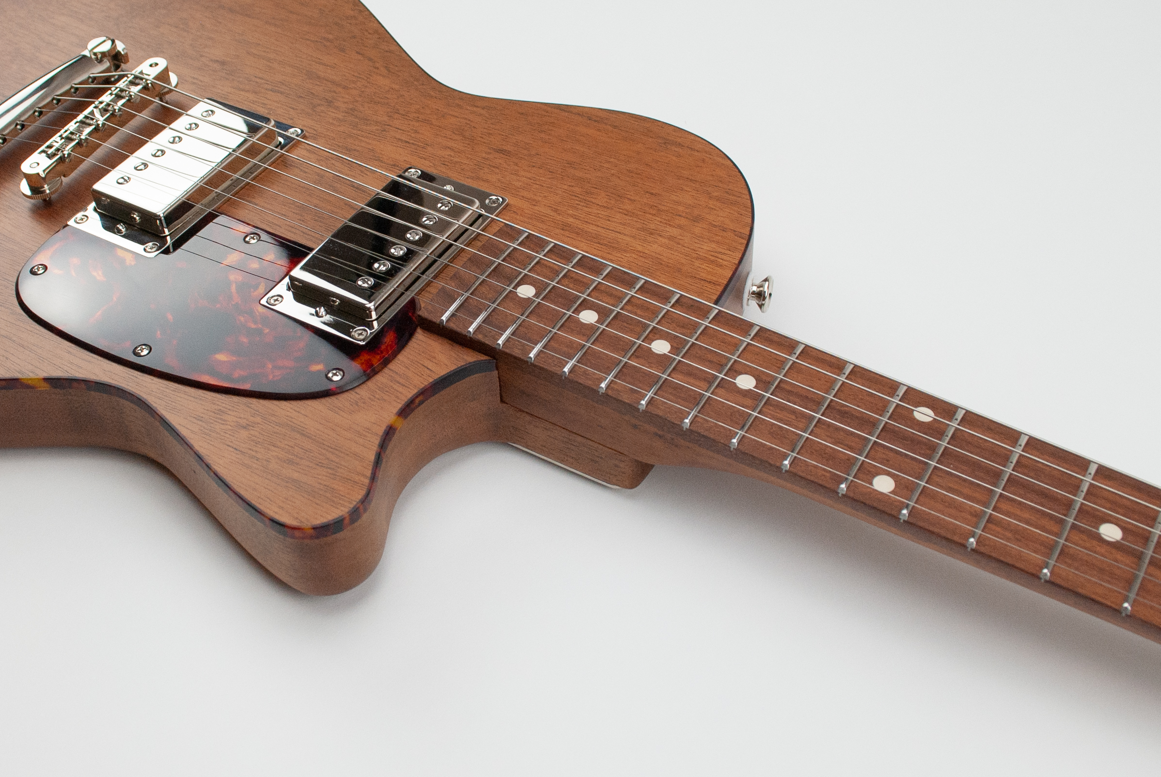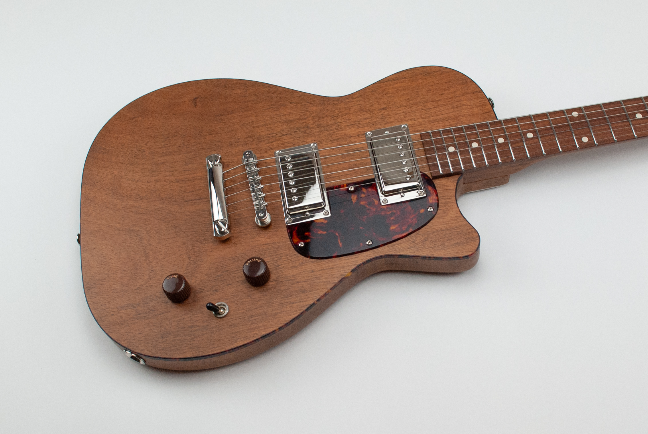 My single cutaway design – a solid body electric adaptation of the catalog brand parlor acoustic guitars of the 50’s and 60’s. Available in a variety of pickup, pickguard, and control configurations. Upgrades include custom colors, semi-hollow construction, specialty woods (based on availability), and other hardware options.