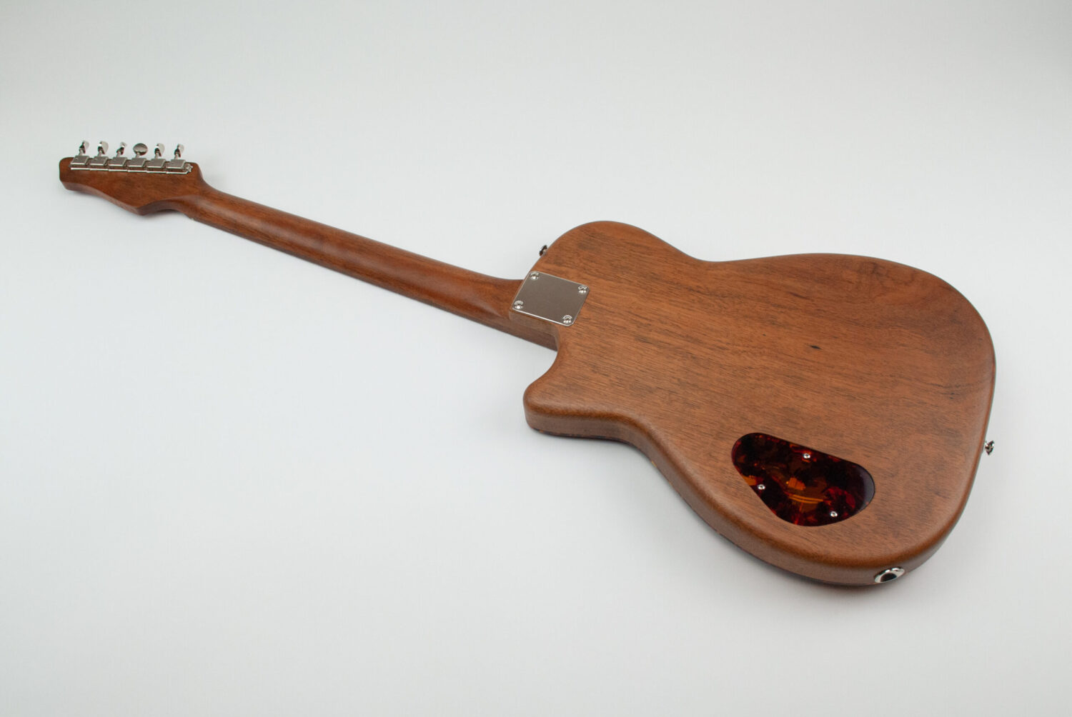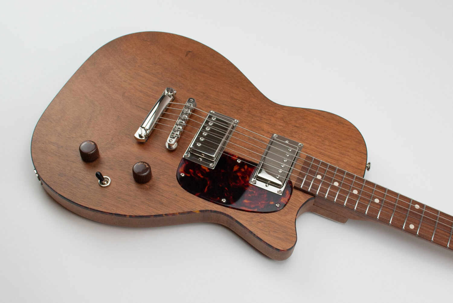 My single cutaway design – a solid body electric adaptation of the catalog brand parlor acoustic guitars of the 50’s and 60’s. Available in a variety of pickup, pickguard, and control configurations. Upgrades include custom colors, semi-hollow construction, specialty woods (based on availability), and other hardware options.